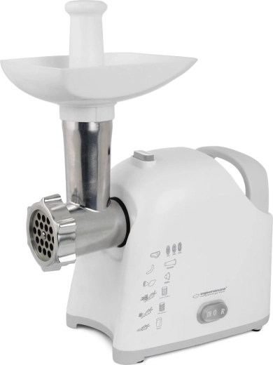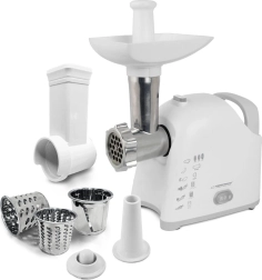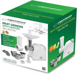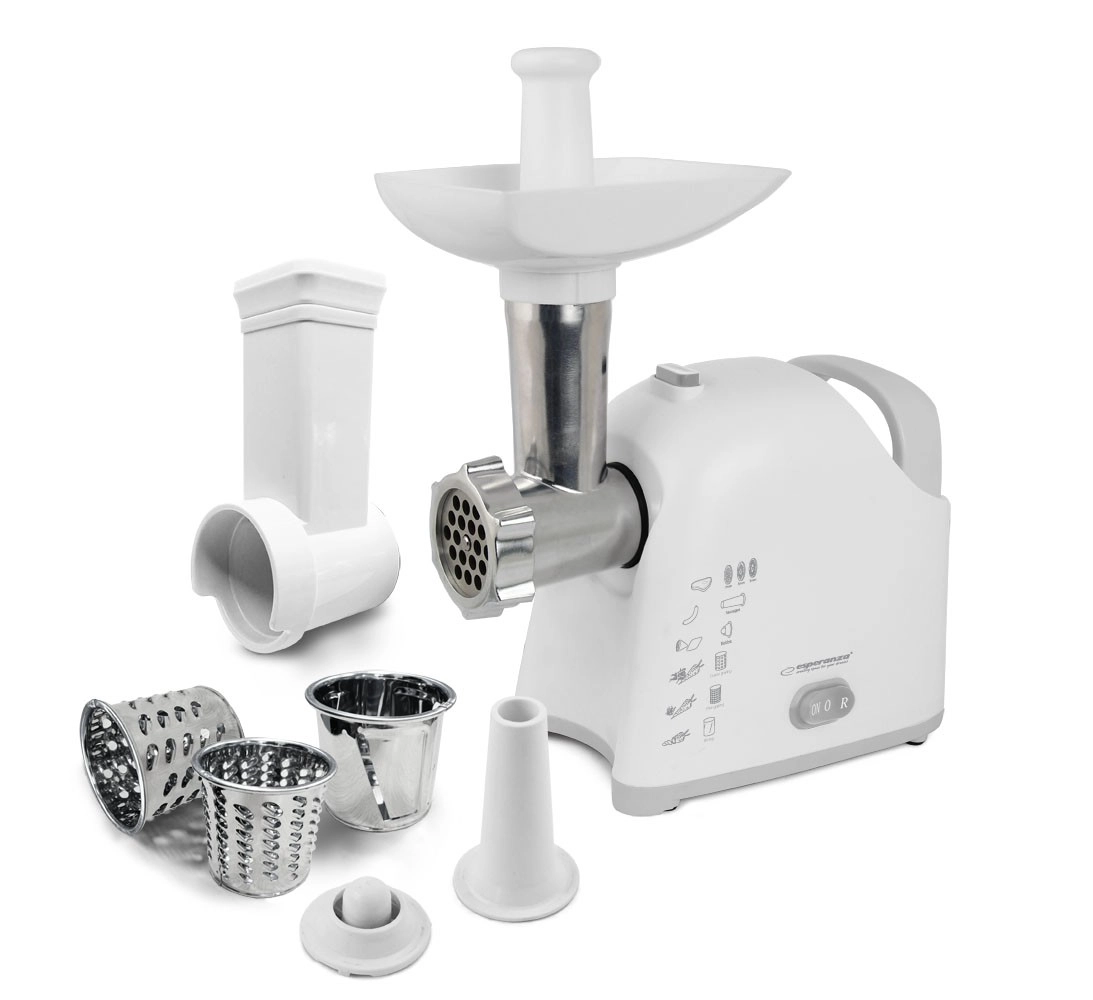 Le hachoir à viande universel avec râpe ESPERANZA Wellington combine haute performance et praticité pour toute cuisine. Grâce à un moteur jusqu’à 2200 W, vous hachez facilement la viande et d’autres ingrédients, et avec trois disques de hachage, vous obtenez la granulométrie souhaitée. Les embouts interchangeables permettent la préparation de saucisses ainsi que de kebab/kebbe, tandis que trois tambours râpeurs traitent rapidement fruits, légumes, fromage, chocolat ou noix. Un entraîneur à vis en métal, une lame en acier inoxydable et des pieds antidérapants assurent longévité et sécurité d’utilisation.