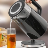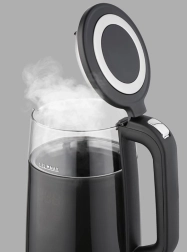 Le boîtier de la bouilloire est en plastique, tandis que l’intérieur est en verre borosilicaté de haute qualité, garantissant durabilité et facilité de nettoyage.