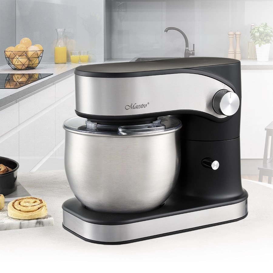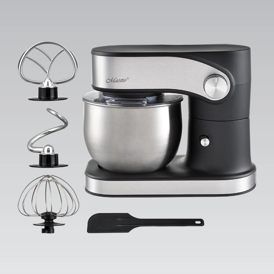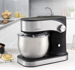 Sont inclus un crochet pétrisseur, une pale de mélange et un fouet ballon, pour préparer pain, pancakes et une neige de blancs d’œufs aérienne. Le couvercle transparent avec ouverture empêche les éclaboussures et permet d’ajouter des ingrédients en cours de fonctionnement. Pour une manipulation aisée, il dispose d’un relevage automatique de la tête, d’une stabilité assurée par des pieds en caoutchouc antidérapants et d’une sécurité renforcée par un verrou et une protection contre la surchauffe.
