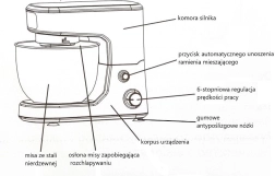 Le contrôle s’effectue via un bouton mécanique et un bouton automatique permettant de relever le corps de l’appareil. L’appareil est livré avec un couvercle anti-éclaboussures et un couvercle avec ouverture pour ajouter des ingrédients pendant le fonctionnement.