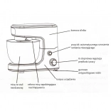 Parmi les autres fonctions : arrêt automatique lors du relèvement de la tête, blocage du mélangeur et pieds en caoutchouc robustes pour une parfaite stabilité. Le verrou de sécurité et la protection contre la surchauffe garantissent une longue durée de vie de l’appareil. Le câble mesure 105 cm ; l’appareil fait 13,5 cm de largeur, 28 cm de hauteur et 28,5 cm de profondeur, pour un poids de 5,25 kg.