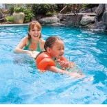 Grâce à ces brassards, les enfants peuvent profiter de moments joyeux dans l’eau tout en apprenant à nager sous surveillance, comme l’illustre la scène détendue au bord de la piscine.