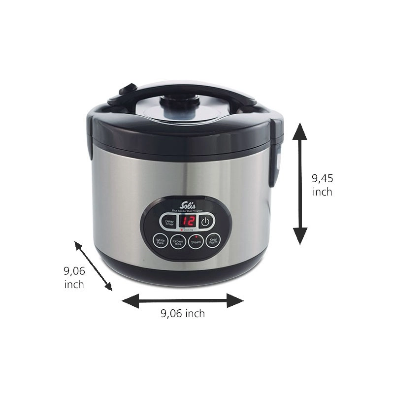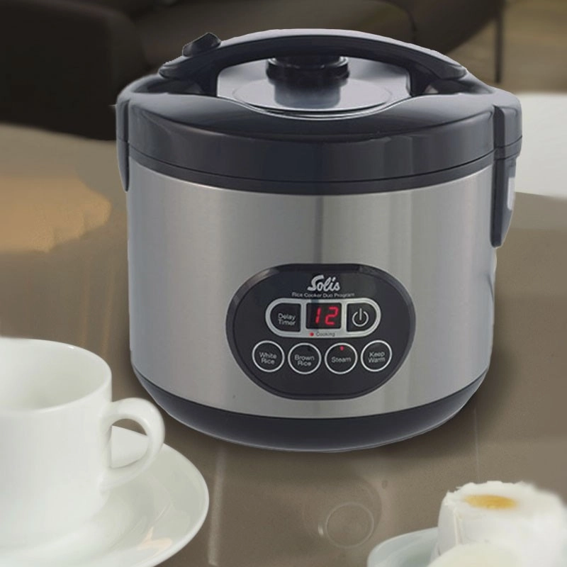 Le cuiseur à riz SOLIS duo program est une solution 2 en 1 intelligente : il prépare un riz blanc, complet ou sauvage parfait (y compris basmati, jasmin, sushi) et cuit simultanément à la vapeur des légumes, du poisson ou de la volaille. Des programmes automatiques assurent une répartition uniforme de la chaleur pour un riz aéré sans brûler. À la fin de la cuisson, l’appareil passe automatiquement en mode maintien au chaud jusqu’à 10 heures puis s’éteint tout seul.