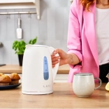 Profitez d’une préparation confortable du thé ou du café avec la bouilloire LAFE Essential. Sa puissance de 2200 W assure une ébullition éclaire de l’eau, tandis que l’indicateur de niveau rétroéclairé permet de vérifier facilement la quantité même en conditions de faible éclairage. La poignée ergonomique et la conception légère en plastique garantissent un service confortable et sûr.