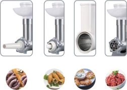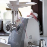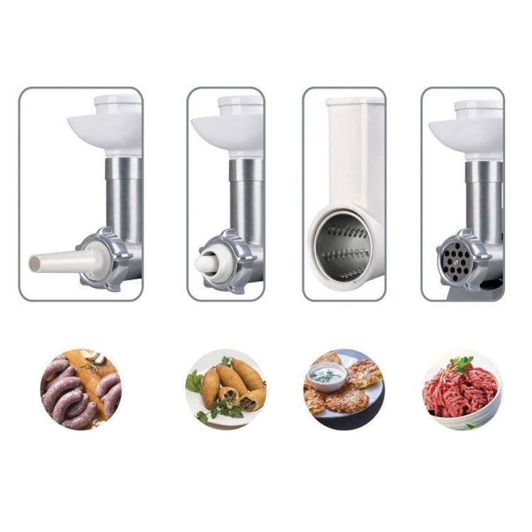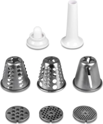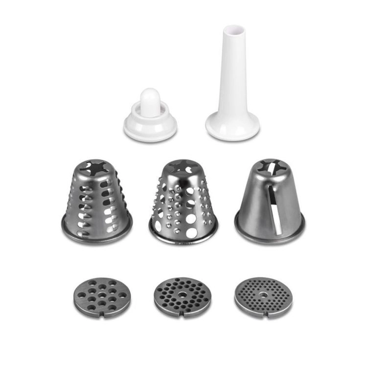Un riche équipement fait de votre hachoir un outil de cuisine polyvalent : trois grilles de hachage 3/5/8 mm pour la texture souhaitée, une pousse-saucisses et un embout pour kebbe, ainsi qu’un jeu de râpes incluant la nouvelle râpe à pommes de terre. Un espace de rangement intégré accueille les grilles inutilisées, et les pièces pour saucisses et kebbe se rangent dans le poussoir. Préparez viande hachée, charcuteries maison, pâtés, galettes de pommes de terre, salades fraîches et fromage râpé.