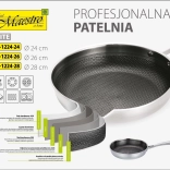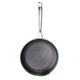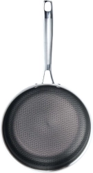 Poêle robuste en inox de 28 cm de diamètre avec une construction triple couche (inox 430 / aluminium / inox 304), une répartition de la chaleur rapide et uniforme et une surface résistante aux rayures avec motif hexagonal en « nid d’abeille ». Compatible avec tous les types de plaques, y compris l’induction, au four jusqu’à 260 °C et au lave-vaisselle.