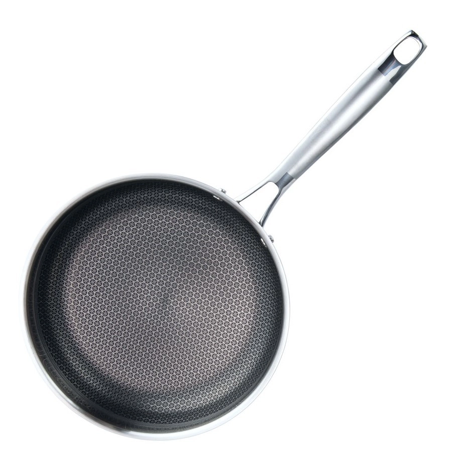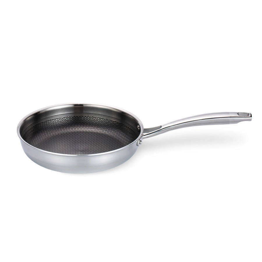 Découvrez une poêle fiable pour la cuisine quotidienne comme professionnelle. Le corps triple couche en acier inoxydable 430, noyau en aluminium et acier inoxydable 304 de qualité alimentaire assure un chauffage rapide et une rétention longue de la chaleur. La texture hexagonale de la surface protège la poêle des rayures tout en favorisant le décollage facile des aliments.