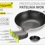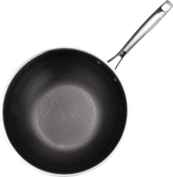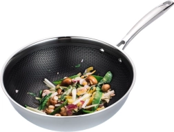 Wok MAESTRO robuste de 30 cm de diamètre avec un corps triple couche en acier inoxydable et noyau en aluminium, garantissant une répartition de la chaleur rapide et uniforme, une résistance aux rayures et une surface antiadhésive à structure en nid d’abeilles. Compatible avec tous les types de plaques, y compris l’induction, doté d’une poignée en inox qui ne surchauffe pas, et compatible lave-vaisselle.
