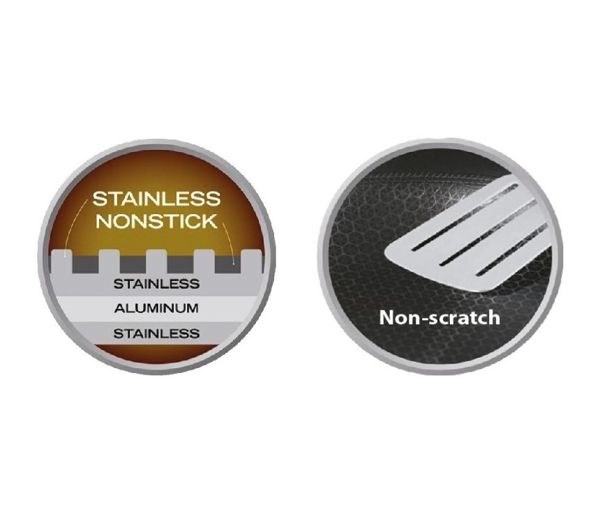 La combinaison d’acier inoxydable 430, d’un noyau en aluminium et d’acier inoxydable alimentaire 304 diffuse la chaleur rapidement et uniformément du fond jusqu’aux bords.