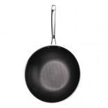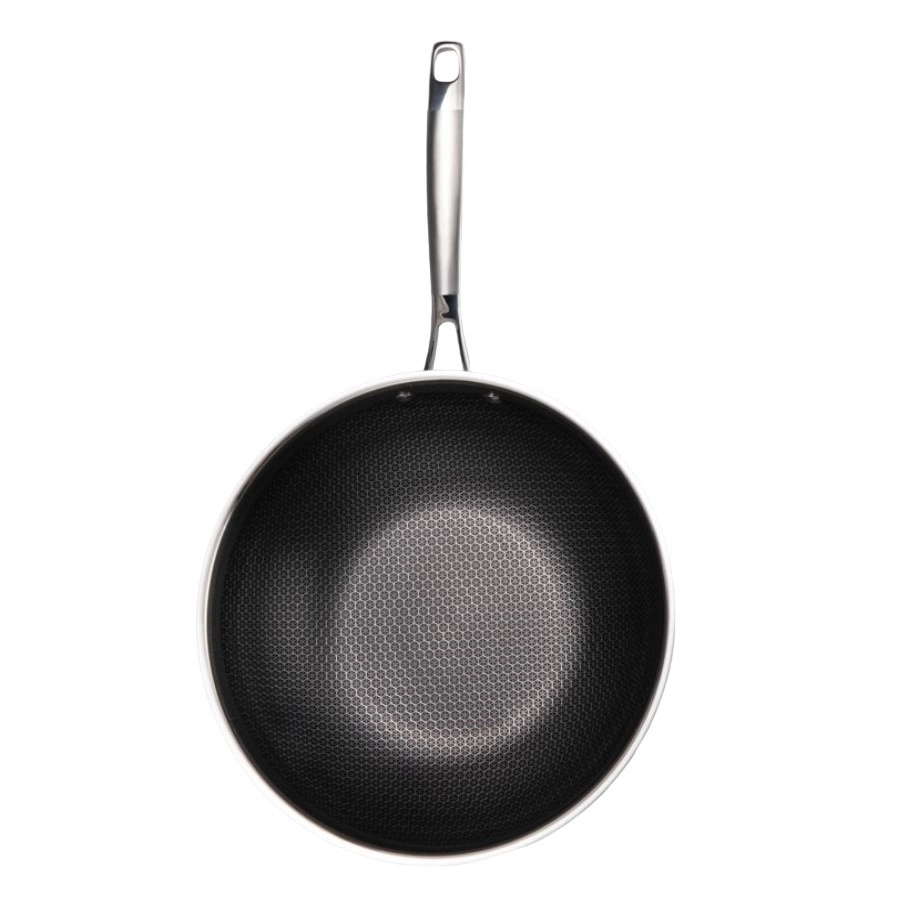 La texture en nid d’abeilles protège la surface antiadhésive contre les dommages et permet d’utiliser des ustensiles métalliques. La paroi épaisse de 5 mm et la hauteur de 9,5 cm assurent stabilité, accumulation de chaleur et mélange aisé. La poignée ergonomique en inox reste froide pendant la cuisson et l’œillet à l’extrémité facilite la suspension.
