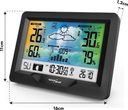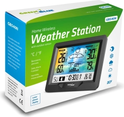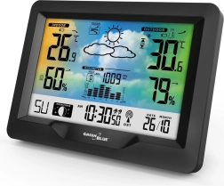 Station météo domestique sans fil GREENBLUE moderne avec écran couleur, heure radio-pilotée DCF, mesure intérieure et extérieure de la température et de l’humidité, baromètre, phases lunaires et prévision météo graphique. Grâce au capteur sans fil, elle surveille les conditions jusqu’à 60 m et l’indicateur de confort ambiant aide à maintenir un climat sain à la maison.