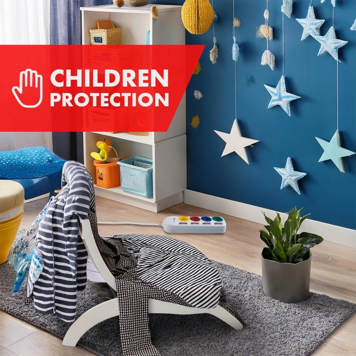 Quatre prises colorées avec sécurité enfant garantissent une utilisation sûre dans les foyers avec enfants et facilitent l’identification de chaque appareil.