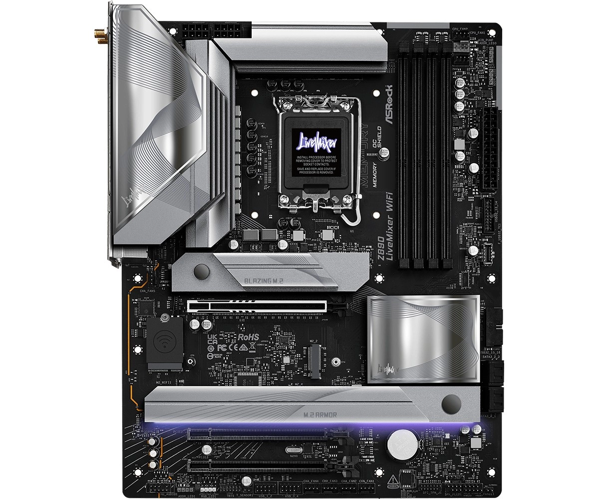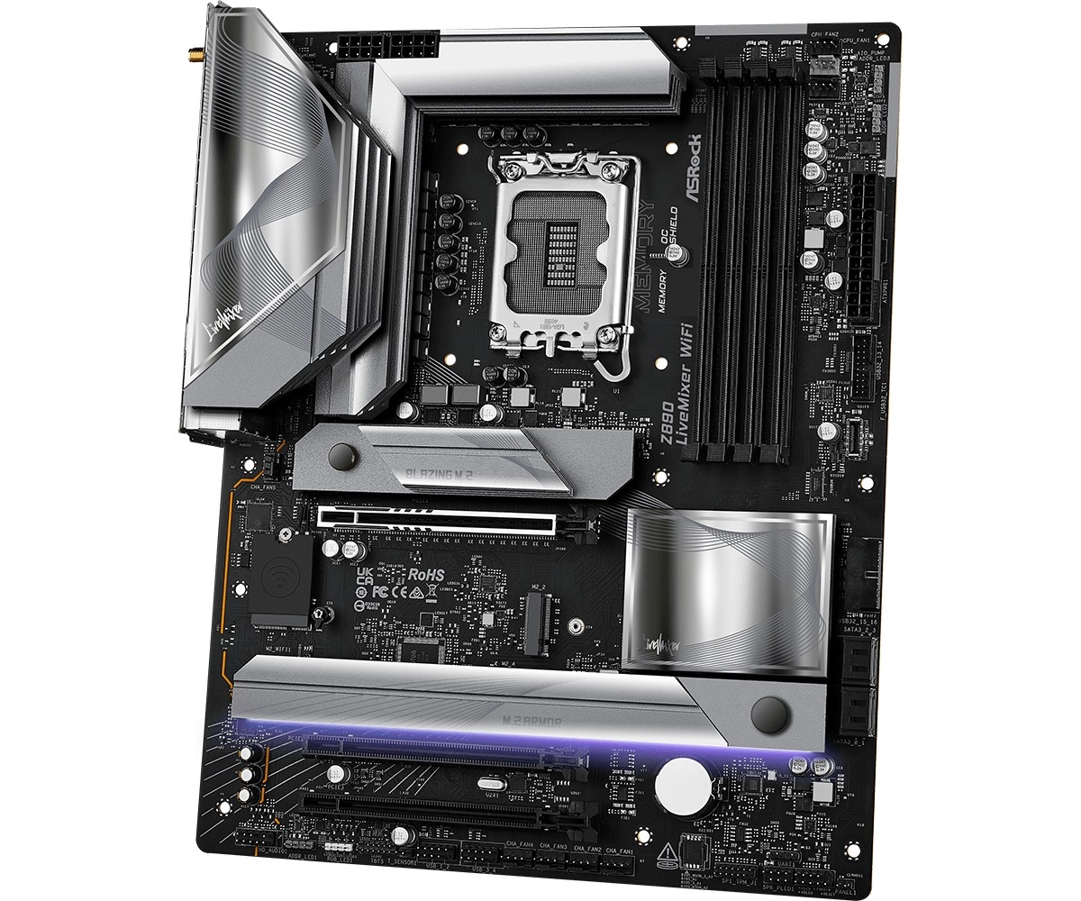 La gamme LiveMixer est conçue pour les créateurs modernes. La carte ASRock Z890 LiveMixer WiFi combine une robuste alimentation en 18+1+1+1+1 phases (80 A SPS pour VCore+GT+SA) avec des options d’extension de pointe : PCIe 5.0 x16 pour les cartes graphiques les plus récentes, trois emplacements M.2 dont Blazing M.2 PCIe Gen5 x4 et une paire de Thunderbolt 4 Type‑C pour une connexion ultra‑rapide des périphériques et des écrans.