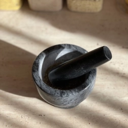 Le mortier en marbre RUHHY est un allié fiable pour tous les amateurs de saveurs authentiques. Le marbre naturel assure une longue durée de vie, une résistance aux fissures et aux rayures et, grâce à son poids, offre une stabilité exceptionnelle pendant l’utilisation. La surface intérieure, légèrement rugueuse, du bol et du pilon maximise la friction et garantit un broyage précis des ingrédients sans effort superflu.