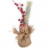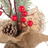 Cette décoration de Noël intemporelle apportera à votre intérieur chaleur, joie et une ambiance hivernale cosy. Le petit sac en jute forme une base naturelle qui s’accorde à merveille avec les branches de conifères, les baies et la pomme de pin. Le petit sapin de Noël en bois et les détails délicats soulignent le caractère festif.