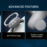 Les poignées texturées et la forme équilibrée offrent du confort même lors de longues sessions. L’arrière est conçu pour une tenue stable et un contrôle précis.