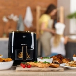 Choisissez parmi 9 programmes automatiques (frites, pizza, fruits de mer, pilons de poulet, steak, muffins, poulet entier, poisson, mode manuel) ou optez pour un réglage manuel avec une température de 80 à 200 °C et un temps jusqu’à 60 minutes. Le panier et la grille antiadhésifs assurent un nettoyage facile et limitent l’absorption des odeurs.