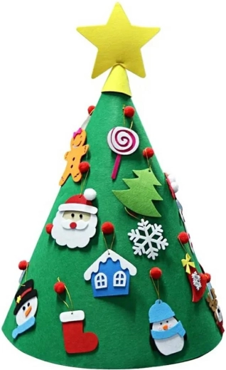 Sapin de Noël 3D en feutrine pour enfants. Excellent jouet pour développer la créativité des plus petits. Équipé de nombreuses décorations amovibles qui peuvent être fixées et retirées à n’importe quel endroit du sapin. Fabriqué en matériau léger et sûr (feutrine). Conçu pour être placé sur une surface. Un crochet spécial permet également une suspension au mur.