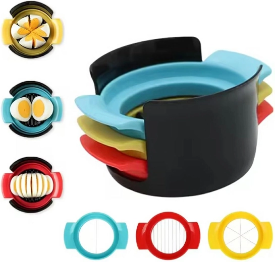 Trancheuse à œufs extrêmement pratique – 3 en 1. Sa construction spéciale est équipée de 3 inserts différents pour couper les œufs en diverses formes. Utilisation extrêmement simple – placez simplement l’insert sur la partie supérieure du récipient et poussez l’œuf à travers. Les lames sont en acier inoxydable, garantissant une utilisation longue et sans problème.