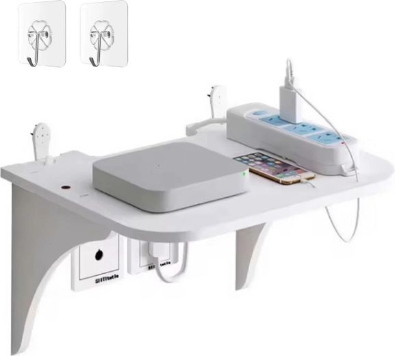 Étagère murale compacte pour routeur Wi‑Fi et autres accessoires. Solution extrêmement pratique et peu encombrante. Installation robuste à l’aide de crochets métalliques à frapper. Ouverture dédiée en partie supérieure pour un branchement facile des câbles réseau. Possibilité de montage alternatif avec deux crochets adhésifs !