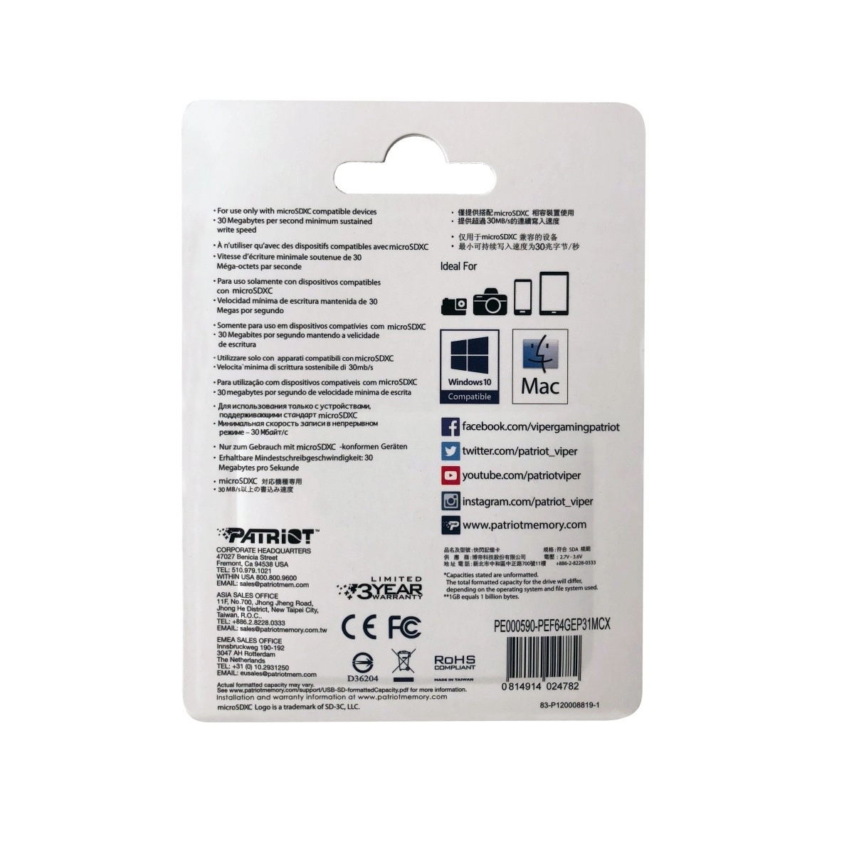 La carte Patriot EP A1 est conçue pour un fonctionnement fluide des applications et une réactivité accrue des appareils. Grâce à la classe de performance A1, vous pouvez non seulement stocker, mais aussi lancer des applications directement depuis la carte, ce qui économise la mémoire interne et améliore les performances du téléphone.