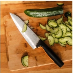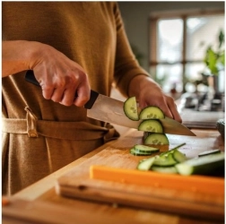 La poignée ergonomique dotée d’un revêtement SoftGrip garantit une prise ferme, tandis que la grande garde protège-doigts augmente le confort et la sécurité. Le couteau est facile à nettoyer et compatible lave-vaisselle. Le couteau parfait pour les cuisiniers modernes à la recherche de qualité et de polyvalence.
