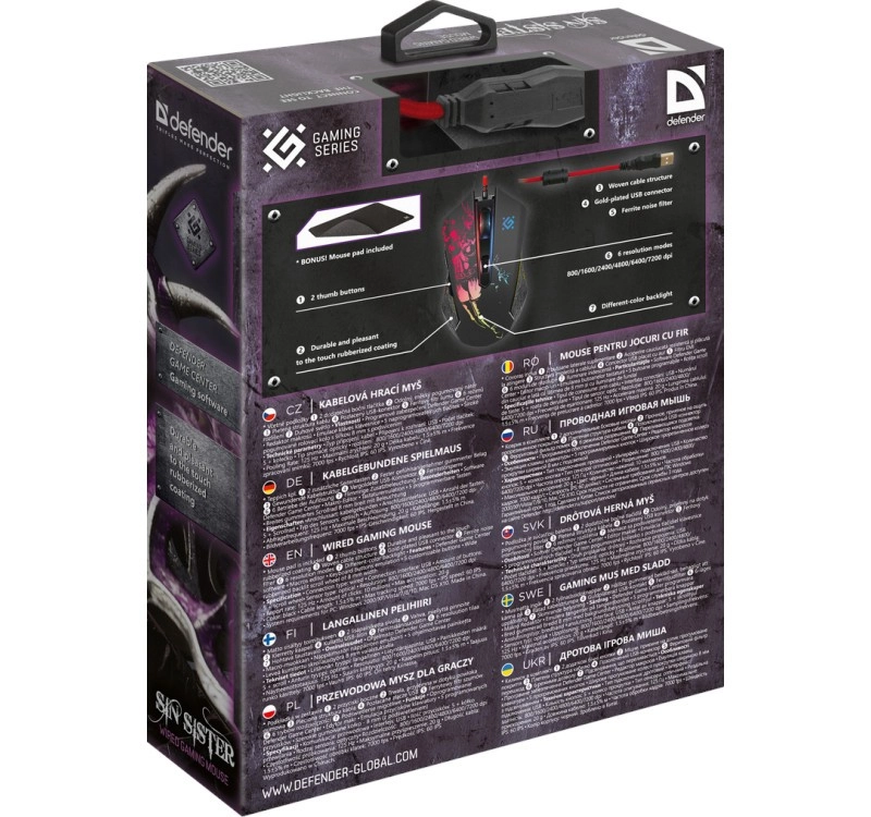 La souris de jeu Defender Sin Sister GM-933 est conçue pour une prise ferme, des réactions rapides et une visée précise. Le capteur optique avec 6 niveaux de résolution jusqu’à 7200 DPI s’adapte à différents genres de jeux comme aux tâches professionnelles. La large molette rétroéclairée et la surface caoutchoutée assurent le confort même lors de longues sessions.