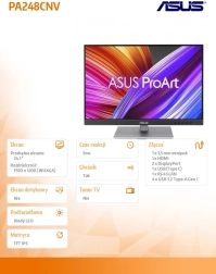 Le moniteur ASUS ProArt PA248CNV est un partenaire indispensable pour tous ceux qui recherchent précision et qualité. Avec sa dalle IPS de 24,1", il offre une résolution WUXGA (1920 x 1200) et un format 16:10 pour une surface de travail accrue. Grâce au calibrage en usine et à la certification Calman, il garantit une précision des couleurs exceptionnelle avec un Delta E < 2. Il couvre 100 % des espaces colorimétriques sRGB et Rec. 709, parfait pour les professionnels de la création.