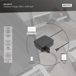 Chargeur DIGITUS puissant et compact avec technologie GaN et USB‑C Power Delivery 3.0, offrant jusqu’à 100 W pour la charge rapide des ordinateurs portables, téléphones et tablettes. Grâce à son câble intégré de 1,2 m et à une protection intelligente contre la surchauffe, les surtensions et les courts‑circuits, il est idéal au bureau, en voyage comme à la maison.