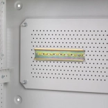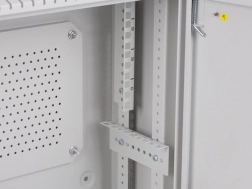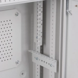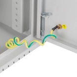 À l’arrière se trouve une plaque de montage perforée (mesh) pour vis M4 et un rail DIN fourni pour une fixation facile des accessoires. Sont inclus le conducteur de mise à la terre, les chevilles et les vis M6 pour une fixation solide et sécurisée. Huit passe-cloisons sécables sur le panneau arrière offrent une grande flexibilité pour les câbles d’alimentation et de données.