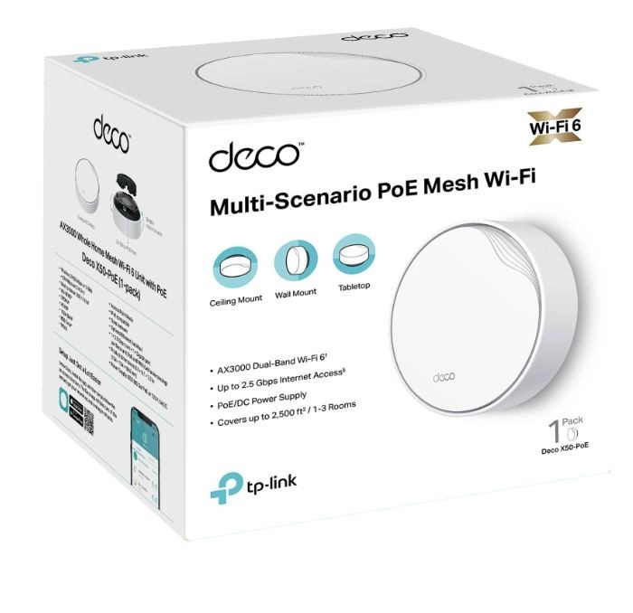 Ce système prend en charge l’alimentation par Ethernet (PoE), ce qui simplifie grandement l’installation et permet un placement flexible des unités. Le Deco X50-PoE est équipé d’un port 2,5 Gbps et d’un port gigabit, tous deux compatibles PoE, assurant une connectivité filaire très haut débit. Son design compact permet une intégration aisée sur une table, un mur ou un plafond.