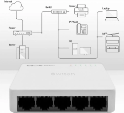 Le commutateur réseau Qoltec fiable avec 5 ports RJ45 pour 10/100 Mb/s assure un transfert de données stable et fluide dans votre réseau domestique ou de bureau. Grâce à la technologie Plug & Play, à l’Auto MDI/MDI‑X, à l’indication LED et aux ports 8 broches blindés, vous étendez facilement le réseau sans configuration complexe ; l’appareil prend en charge jusqu’à 1024 adresses MAC et offre une portée du signal jusqu’à 150 m.