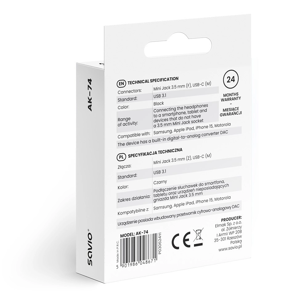 L’adaptateur audio Savio au design noir élégant s’accorde parfaitement avec tous les styles. Il est compatible avec un large éventail d’appareils, y compris les smartphones et tablettes de marques renommées telles que Samsung, Apple (iPad, iPhone 15 et 16) et Motorola. La norme USB 3.1 assure une transmission audio rapide et stable, permettant une lecture fluide de la musique, des podcasts ou des appels téléphoniques avec vos écouteurs préférés.