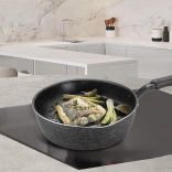 Grâce à sa profondeur de 7,5 cm, préparez facilement goulash, sautés, pâtes ou légumes rissolés. Les becs verseurs doubles offrent un service précis des sauces et bouillons sans éclaboussures. La poêle convient à tous les types de cuisinières, y compris l’induction, et sa poignée ergonomique garantit une manipulation confortable et sûre.