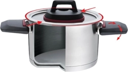 La casserole est équipée de poignées pliables qui facilitent le rangement et économisent de l'espace dans la cuisine. Elle est compatible avec tous les types de plaques de cuisson, y compris les plaques à induction, ce qui en fait un assistant polyvalent pour chaque cuisine. L'échelle graduée intérieure est un accessoire pratique pour mesurer précisément les liquides.