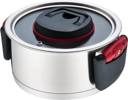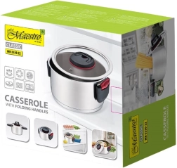 La casserole est équipée d'un couvercle en verre avec un trou pour l'évacuation de la vapeur, permettant de surveiller le processus de cuisson sans avoir à le soulever constamment. Grâce aux poignées pliantes, la casserole se range facilement et économise un espace précieux dans la cuisine.