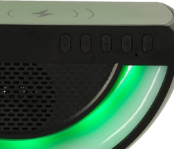 Une station de charge sans fil moderne avec haut-parleur intégré et éclairage LED vert offre un look stylé en phase avec les tendances technologiques actuelles.