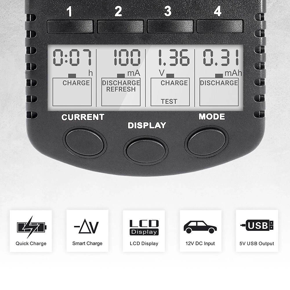 Grâce aux modes intégrés, il permet non seulement la charge, mais aussi la décharge et le test de capacité. Le mode de décharge/test ajusté peut vérifier et enregistrer la capacité de toute cellule dans la plage 1,2–1,6 V (y compris alcalines et Ni‑Zn) – pratique pour comparer l’état réel des batteries. L’écran LCD informatif affiche en continu les données clés et facilite le contrôle du processus.