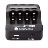 Le chargeur intelligent EVERACTIVE, fiable, est conçu pour la recharge et l’entretien de 1 à 4 accumulateurs R6 AA et R03 AAA de type Ni-MH et Ni-Cd. Vous apprécierez la commande simple, la gestion indépendante de chaque emplacement et des algorithmes optimisés pour les cellules à résistance interne plus élevée ainsi que pour les accumulateurs modernes LSD (Ready to Use, ENELOOP).