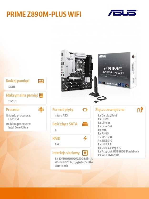 Les cartes mères ASUS de la série PRIME sont conçues par des experts pour exploiter pleinement le potentiel des derniers processeurs Intel Core Ultra (Série 2). La carte mère PRIME Z890M-PLUS WIFI, dotée d’une alimentation robuste, d’une solution de refroidissement complète et d’options d’optimisation intelligentes, offre aux utilisateurs et aux passionnés de nombreuses optimisations de performance via des fonctions logicielles et micrologicielles intuitives. Elle est conçue pour être prête pour les PC avancés à intelligence artificielle et fournir les performances et la connectivité nécessaires aux applications d’IA exigeantes.