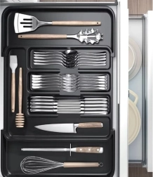 Optimisez l’espace de votre tiroir grâce à un design extensible astucieux. L’organisateur s’ajuste en douceur à différentes largeurs de tiroirs pour que couverts, couteaux et spatules soient toujours rangés de façon claire. La conception robuste en PP garantit une longue durée de vie, une résistance aux rayures et un entretien aisé.