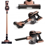 L'emballage comprend différents types d'accessoires, tels qu'une brosse électrique, une brosse 2en1 pour les tissus d'ameublement et un long suceur pour les interstices, permettant un nettoyage efficace des différentes surfaces, des tapis aux sols durs.
