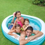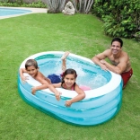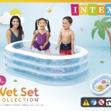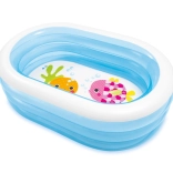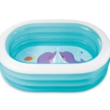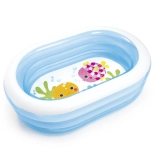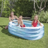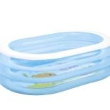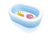 Piscine gonflable transparente pour enfants, avec un motif 1 Monde aquatique 7 au fond. La piscine est fabriquée en vinyle massif testé. Elle possède des parois transparentes, trois anneaux gonflables séparés qui sont sécurisés contre les fuites d'air non désirées et une valve de vidange. Un kit de réparation est fourni avec la piscine pour les petites réparations.