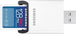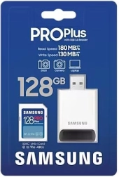 Carte mémoire professionnelle SAMSUNG PRO Plus avec une capacité de 128 Go et un lecteur inclus, offrant une vitesse de lecture jusqu’à 180 Mo/s et une vitesse d’écriture jusqu’à 130 Mo/s pour une vidéo 4K fluide et des rafales rapides. Conception résistante avec protection 7x et garantie 10 ans, idéale pour les photographes, créateurs de contenu et professionnels.
