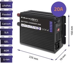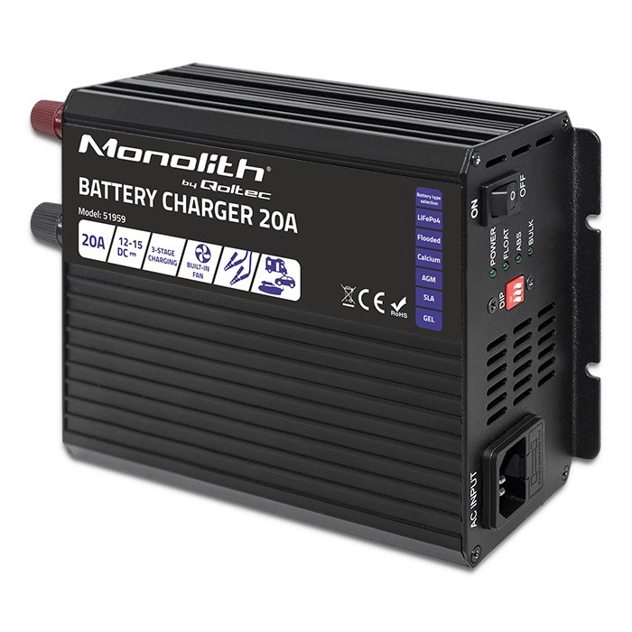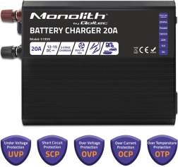 Le chargeur MONOLITH 12 V / 20 A est conçu pour une recharge rapide, sûre et respectueuse des batteries de démarrage comme de traction. L’algorithme à 3 étapes BULK – ABS/BOOST – FLOAT adapte automatiquement tension et courant à l’état de la batterie, réduit le temps de charge et prolonge sa durée de vie. Les voyants LED affichent clairement la phase en cours.