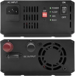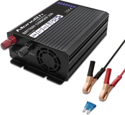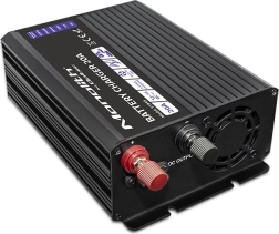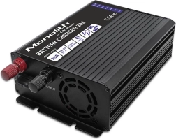 Grâce à l’interrupteur DIP, vous sélectionnez plusieurs modes selon la chimie : LiFePO4, AGM, GEL, SLA/plomb (y compris Ca, flooded) ainsi qu’un mode alimentation stabilisée. Le châssis en aluminium robuste améliore la dissipation thermique, le ventilateur actif protège l’électronique en forte charge et, une fois la batterie pleinement chargée, l’appareil bascule automatiquement en mode maintien/veille.