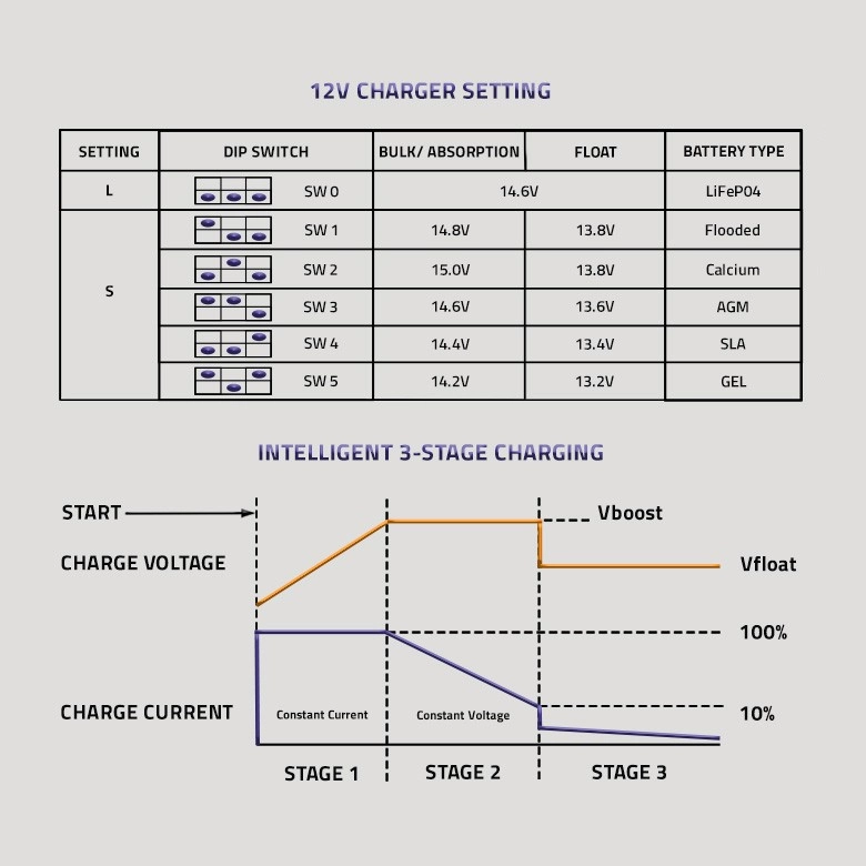 Avec l’interrupteur DIP, choisissez le profil optimal pour LiFePO4, AGM, GEL, SLA/plomb (y compris Ca, flooded) ou le mode alimentation stabilisée. Un seul chargeur pour plusieurs types d’accus.