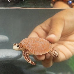 La carapace épaisse de la tortue huppée est d’une couleur brun-rouge qui se détache sur le fond bleu foncé de l’océan. Les pattes avant et arrière de ce reptile aux yeux noirs présentent également des motifs bruns et jaunes. Elle est vraiment magnifique lorsqu’elle nage au milieu de l’écume marine. Peut-être nous laissera-t-elle l’observer de près si nous lui offrons une petite collation ?