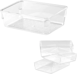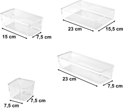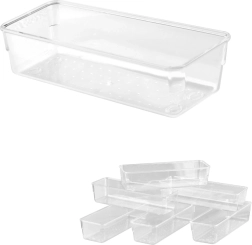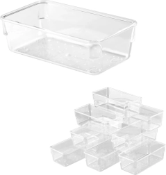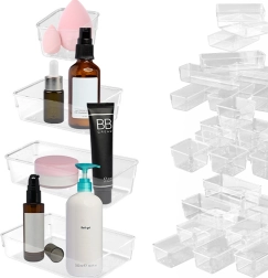 Gardez chaque tiroir et votre bureau en ordre avec ce set de 25 organiseurs transparents en acrylique disponible en quatre tailles. Grâce à leur utilisation universelle, leur transparence claire et leur acrylique résistant, vous triez facilement les petits objets au bureau, dans la salle de bain, la cuisine ou l’atelier.