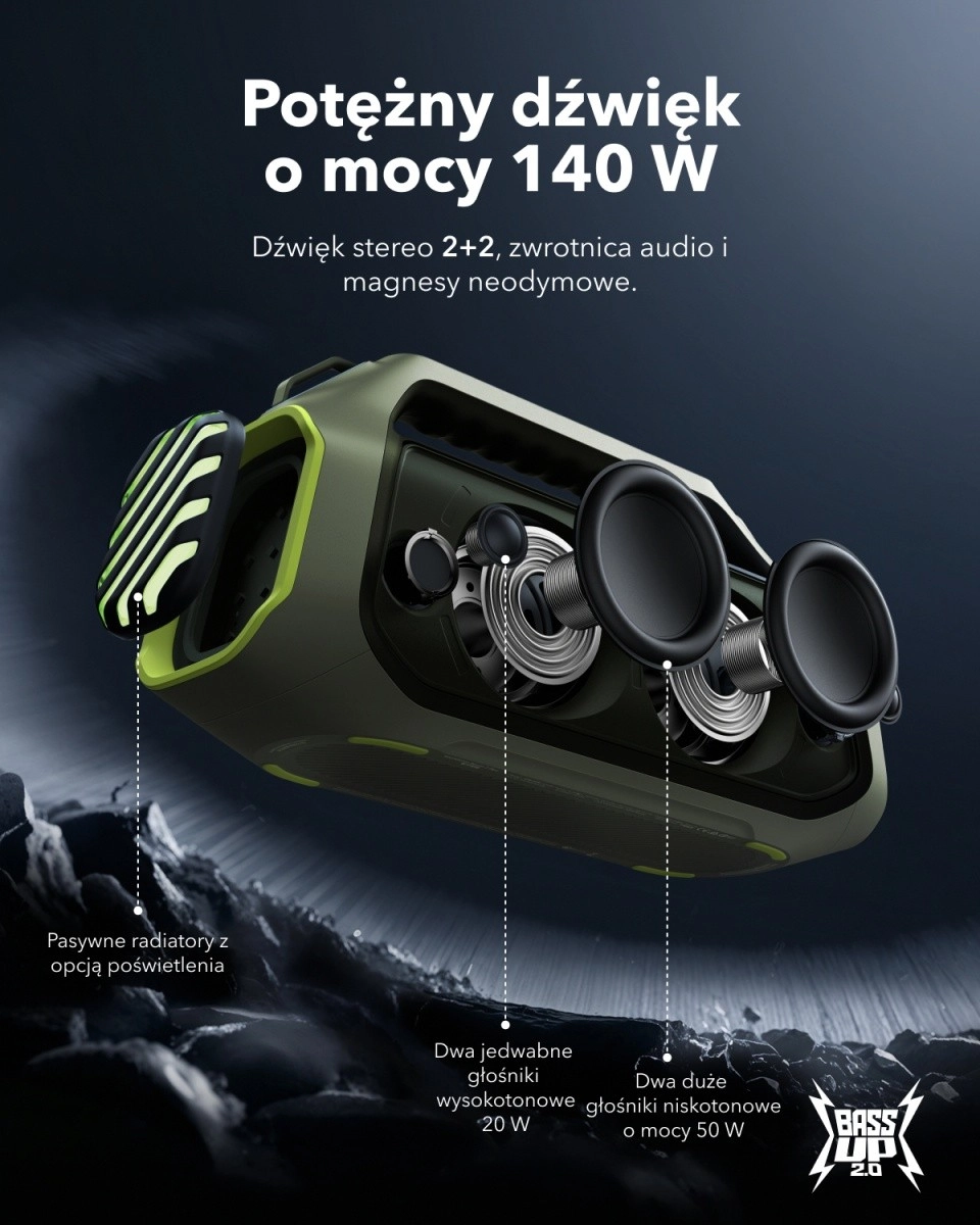 La Soundcore Boom 2 Plus est conçue pour le divertissement en plein air : elle offre un son stéréo clair et puissant avec un rendu détaillé grâce aux membranes en titane avec une réponse en fréquence allant jusqu’à 40 kHz. L’exclusive BassUp analyse la musique en temps réel et renforce les basses fréquences pour des basses vraiment puissantes sans distorsion.